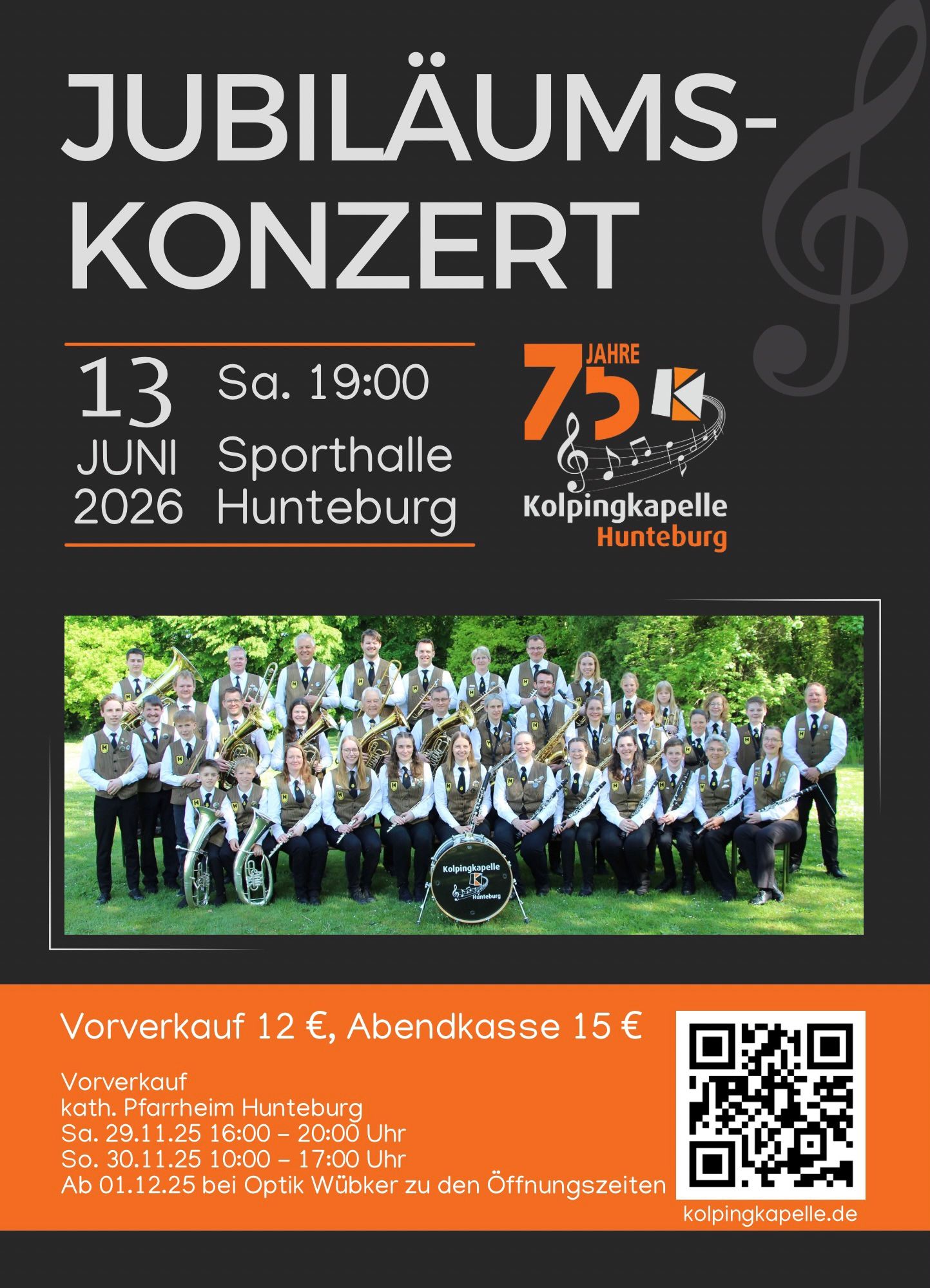 Die Kolpingkapelle Hunteburg wird im nächsten Jahr 75 Jahre alt! Das wollen wir mit euch feiern. Am Samstag, 13. Juni 2026 findet ein großes Jubiläumskonzert in der Sporthalle Hunteburg statt.