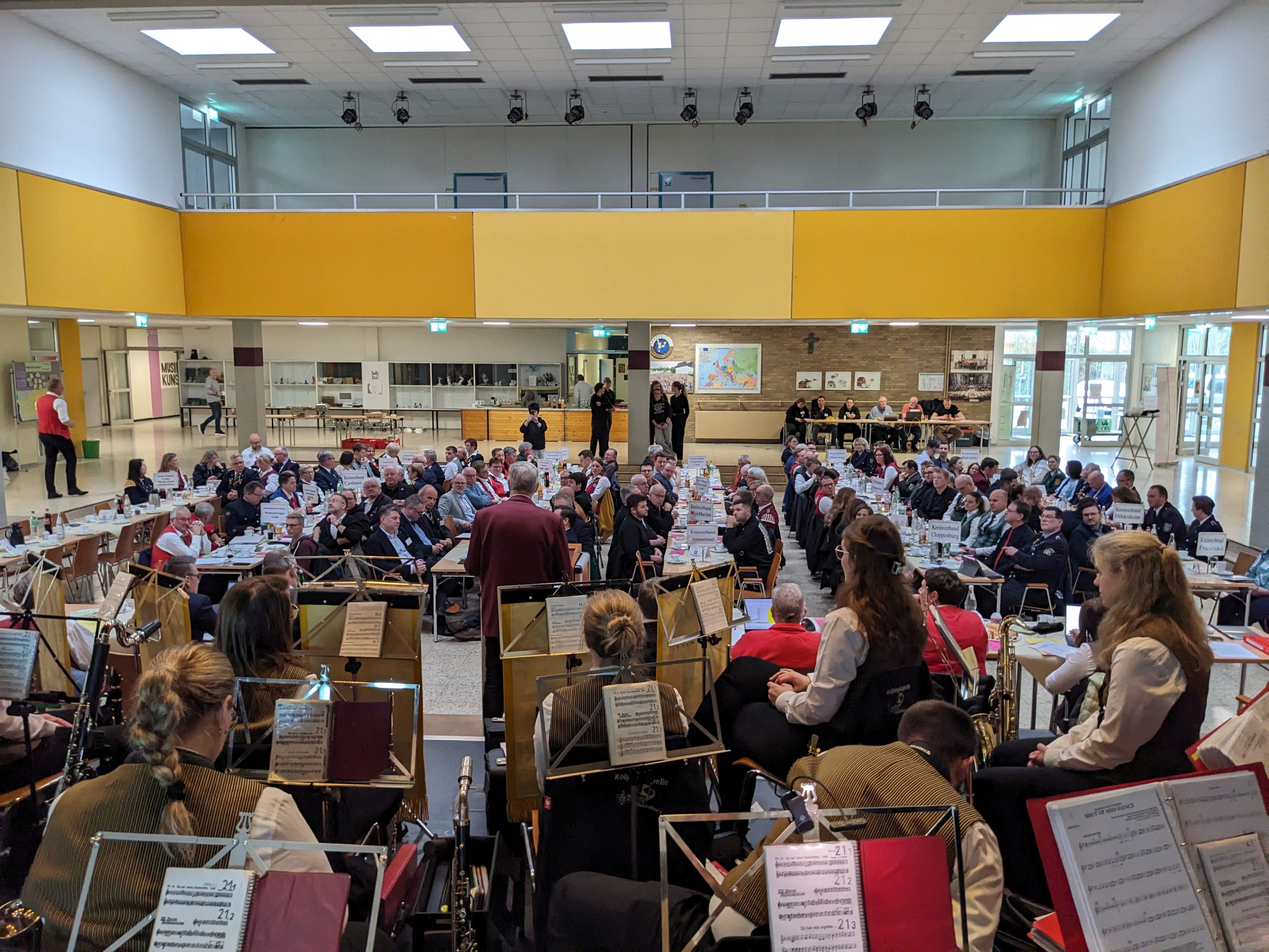 Die jährlich stattfindende Versammlung findet immer in unterschiedlichen Landkreisen statt. In diesem Jahr war der Kreismusikverband Osnabrücker Land der Ausrichter dieser Veranstaltung. Im Gymnasium Bersenbrück kamen Vertreter aus dem gesamten Bundesland zusammen. Vor dem offiziellen Start am Samstagnachmittag konnten wir als Begrüßungsmusik die ankommenden Gäste musikalisch unterhalten. Nach unserem Auftritt startete dann die Versammlung in der gut gefüllten Aula der Schule.
