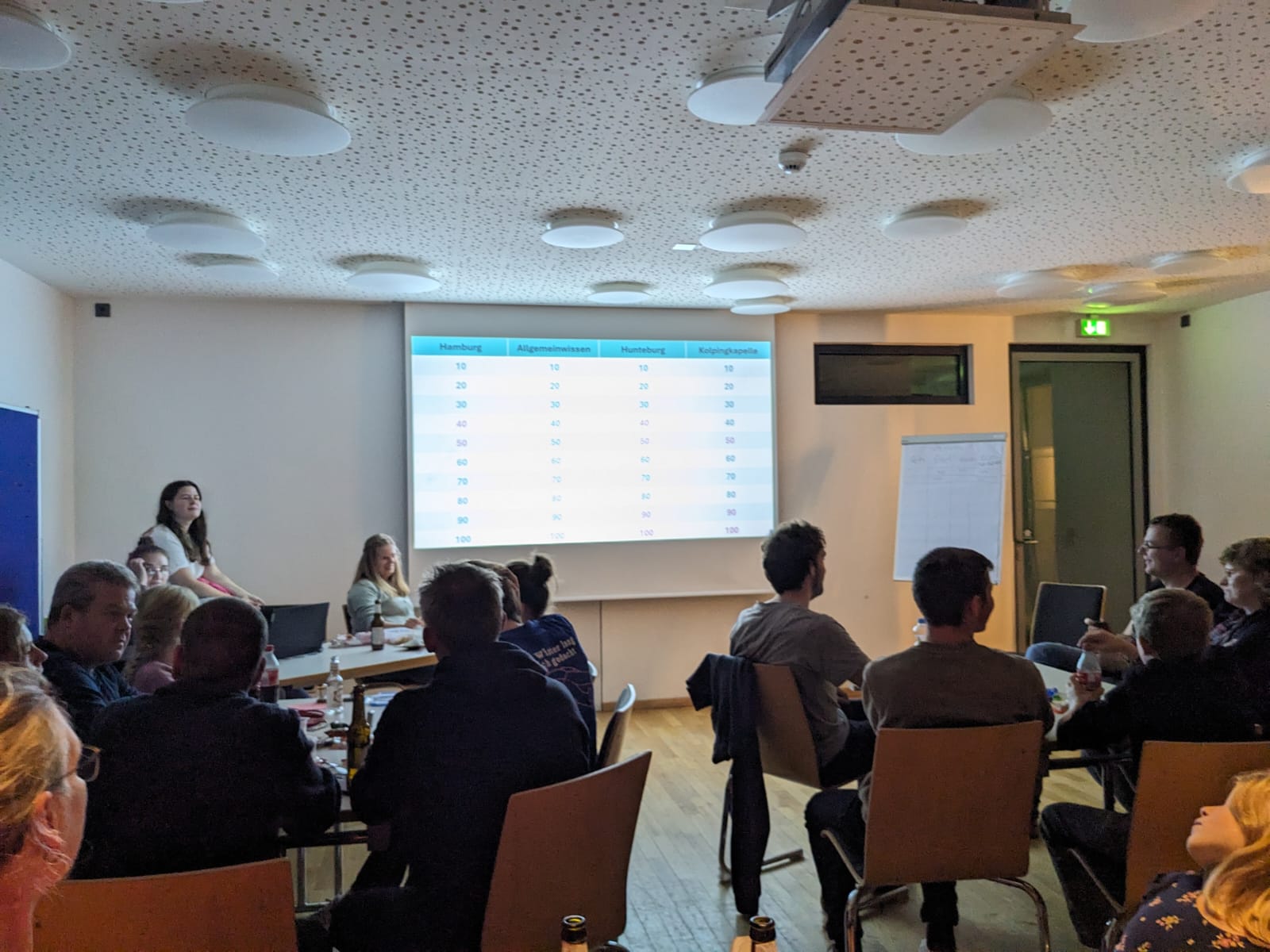 Am Samstag brachen wir nach dem Frühstück zu einer Stadtführung auf. In zwei großen Gruppen konnten wir viele spannende Details über Hamburg kennenlernen. Am Nachmittag war Zeit für individuelle Erkundungsrundgänge. Nach dem Abendessen fand dann der große Quizabend statt, der vom Orga-Team vorbereitet wurde. Hierfür hat es sich gelohnt bei den Ausflügen aufzupassen. Neben Fragen zur Kapelle oder Hunteburg, waren auch eine Fragen rund um Hamburg mit auf dem Plan.